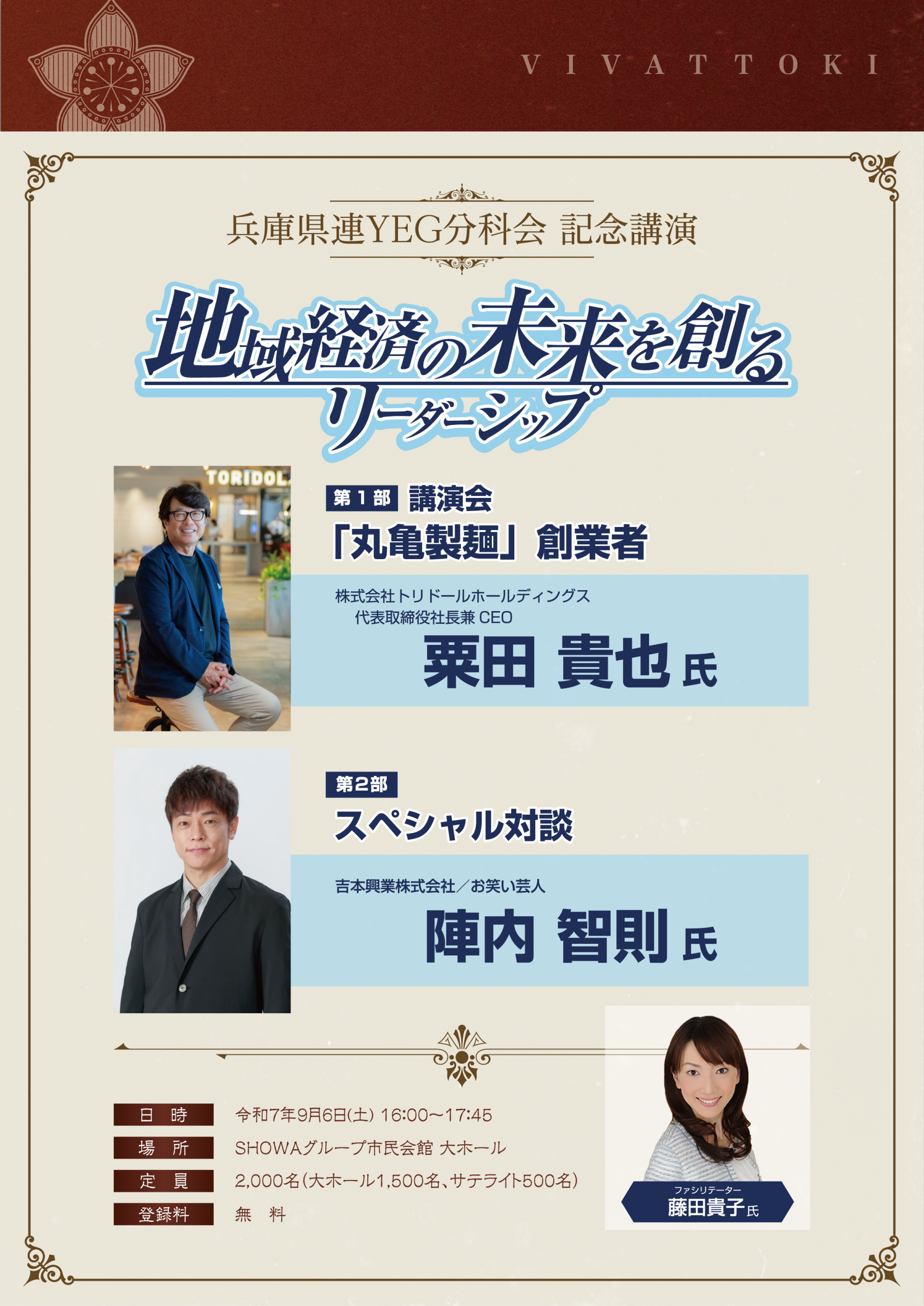 粟田氏と陣内氏は加古川観光大使を務めておられ、地元加古川のPRにご尽力いただいています。お二人のトークセッションで地域経済の未来を創るリーダーシップについて深堀りしていただきます。
